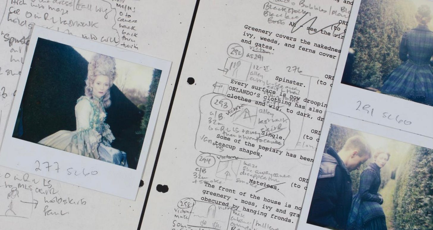 Penny Eyles’ BFI continuity script of Sally Potter’s Orlando is fascinating. Orlando is one of my favourite movies. I saw it on its release in 1992. As an impressionable 17-year-old, it paved the way for me to study film and my own attempts at making movies. Full of annotations and photos, including Tilda Swinton’s changing eye colour. I need to go back and rewatch. I have a BFI subscription, which is fortunate.